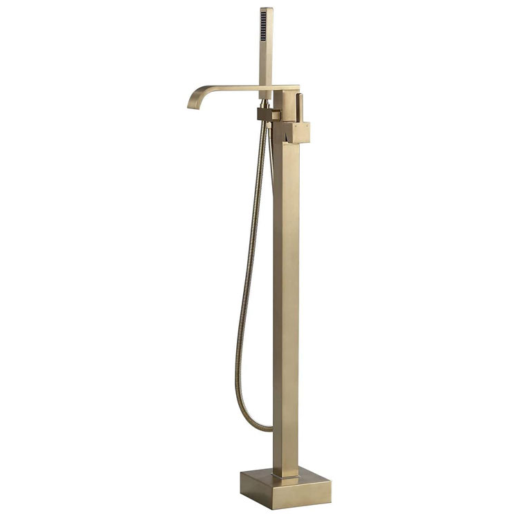 Yanasi® Brushed gold freestanding bathtub mixer bahan kuningan body, zinc alloy handle faucet. Entuk sertifikat cUPC / Watermark / CE / ACS, kita bisa nyedhiyakake OEM
